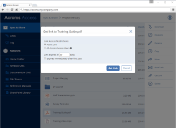 Acronis Files Advanced pozwala użytkownikom łatwo synchronizować i udostępniać pliki z dowolnego miejsca, w dowolnym czasie i z dowolnego urządzenia (komputery PC, komputery Mac, smartfony lub tablety). Obsługiwane źródła danych obejmują serwery plików, NAS, systemy zgodne z programem SharePoint i CMIS, takie jak Alfresco lub EMC Documentum.
